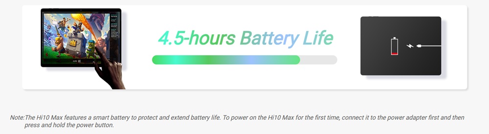 - Langdurige prestatie met een verlengde batterijduur van maximaal 4.5 uur. De Hi10MAX is voorzien van een slimme batterij die de batterij beschermt en de levensduur verlengt: