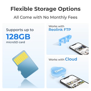 - De camera bevat een voor-geïnstalleerde 32GB micro SD-kaart. Met ondersteuning voor een micro SD-kaart tot 128GB en gecodeerde cloudopslag, zorgt deze camera ervoor dat uw opnamen veilig worden opgeslagen op basis van uw behoeften;