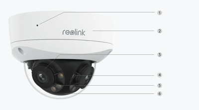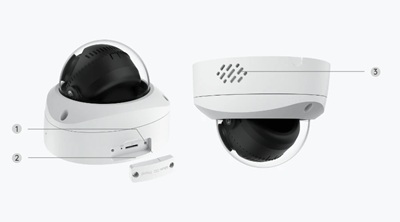| 1) Microfoon; 2) Logo; 3) Lensrubber; 4) Spotlight & IR LED; 5) Spotlight & IR LED; 6) Daglichtsensor. | 1) Micro SD-kaartslot; 2) Resetknop; 3) Speaker. |