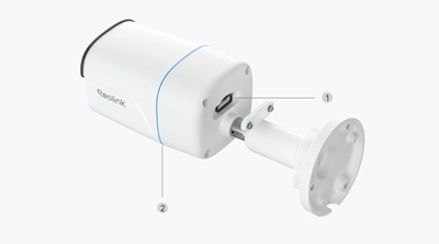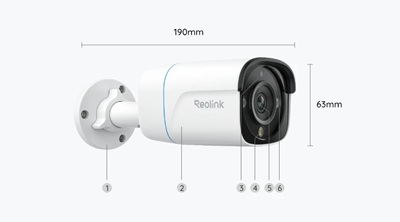 | 1) Bevestiging; 2) Metaal/aluminium behuizing; 3) Daglichtsensor; 4) Spotlight; 5) Lens; 6) Infrarood LED | 1) Micro SD-kaartslot; 2) Waterdichte afdichting |