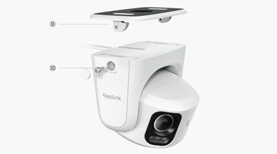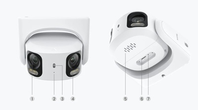| 1) Lens; 2) Microfoon; 3) Daglichtsensor; 4) Spotlight & IR LED; 5) Speaker; 6) Micro SD-kaartslot; 7) Resetknop | 9) Bevestigingsbeugel 10) Installatieschroeven |
