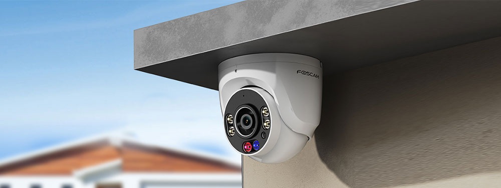 Foscam W5EP, 3K/5MP QHD PoE IP camera, met knipperende rode en blauwe alarmlichten