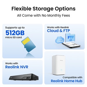 - Opnames kunnen worden opgeslagen op een micro SD-kaartslot (max 512GB, niet bijgesloten) een Reolink NVR, Home Hub of FTP server of in de Reolink Cloud;